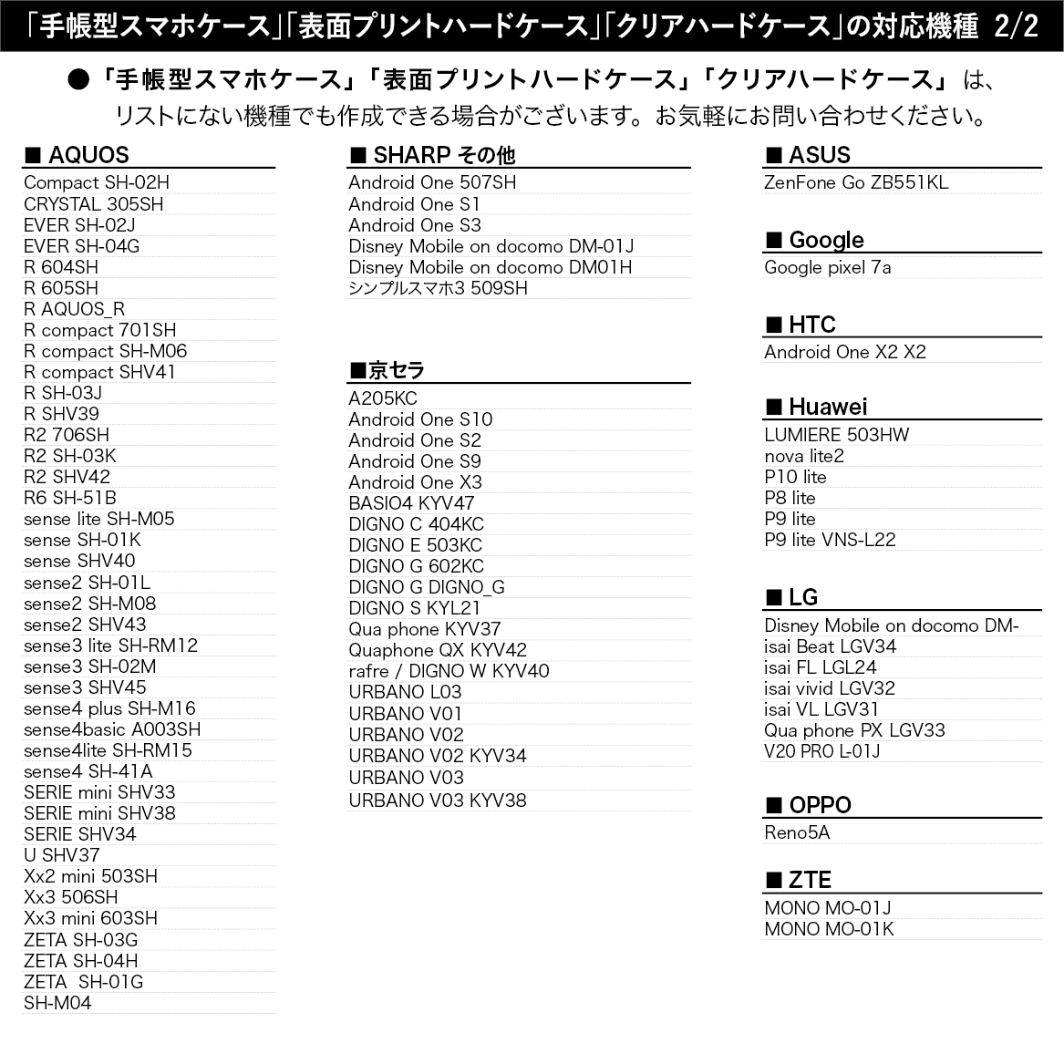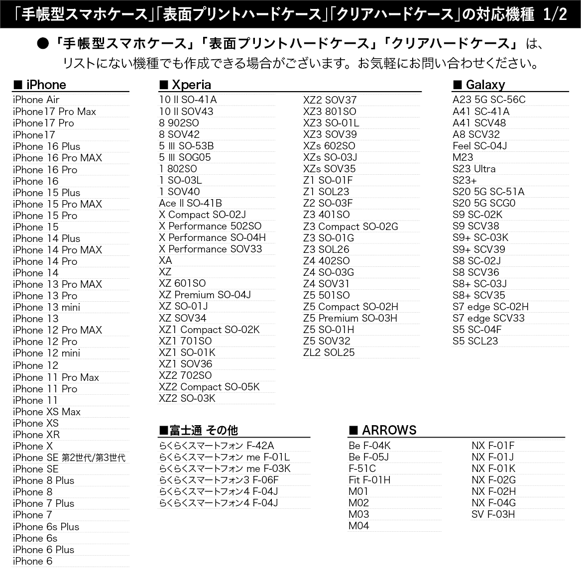 「手帳型スマホケース」「表面プリントハードケース」「クリアハードケース」は、一覧にない機種でも作成可能な機種が多くございます。