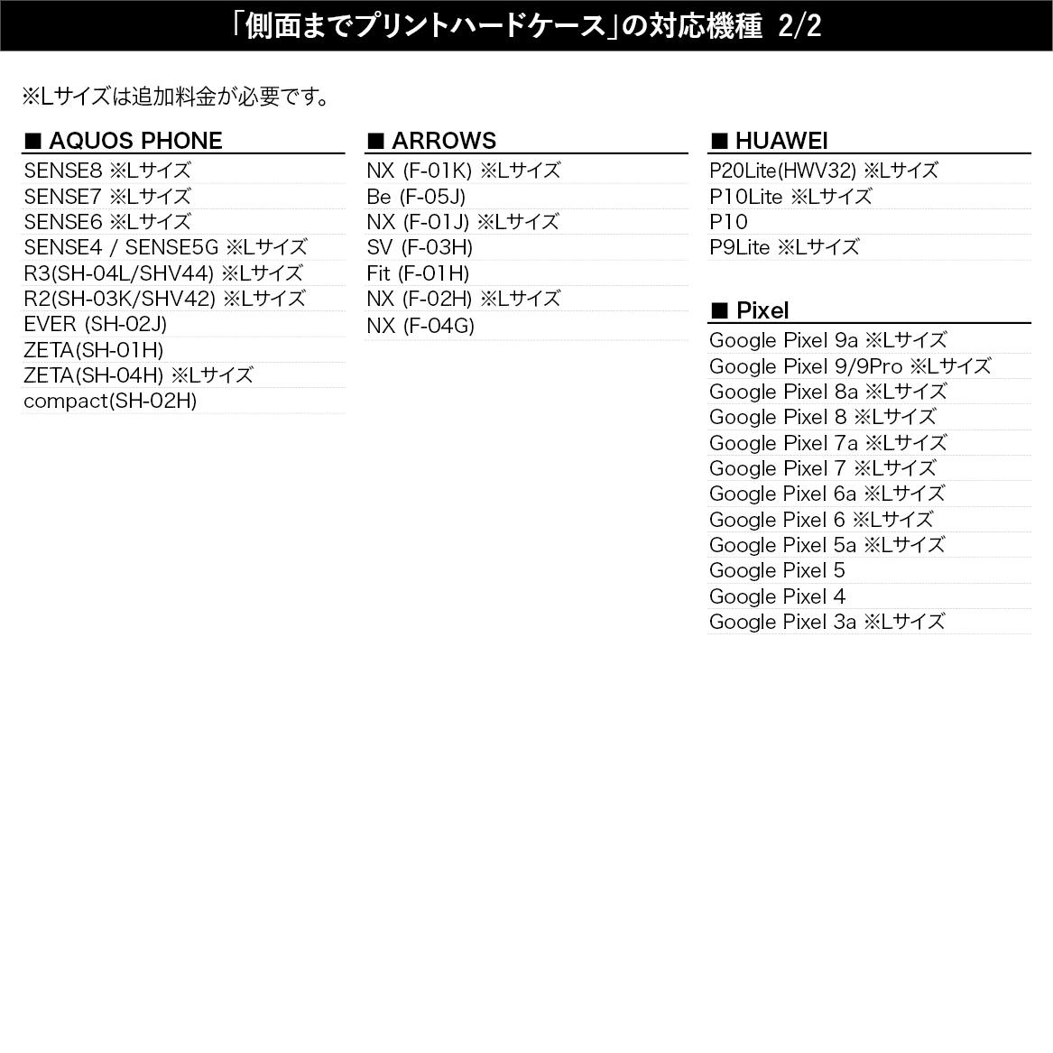 ▼「手帳型スマホケース」「表面プリントハードケース」「クリアハードケース」の対応機種一覧